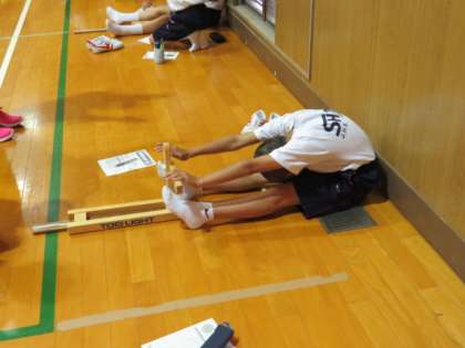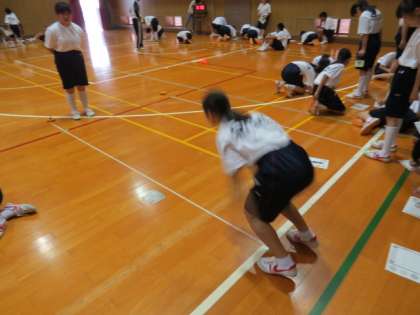 「反復横とび」「長座体前屈」「握力」「立ち幅跳び」「上体起こし」それぞれの場所で、みんな一生懸命がんばっています。いい記録は出たでしょうか?