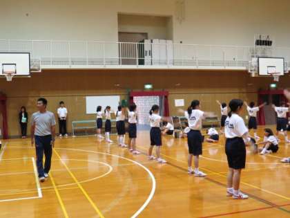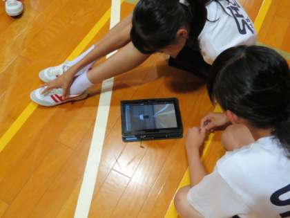 本日6月6日(火)、本校で「中学校新任教員ICT活用研修」が行われ、保健体育科と社会科の新任教員に対し、公開授業を行いました。1年生の体育の授業では、ラジオ体操第2の動きを習得するために、生徒同士ペアを組んで、タブレットを使ってお互いの動きを動画撮影し、動きの確認と、改善点を指摘し合い、修正するという学習をしました。