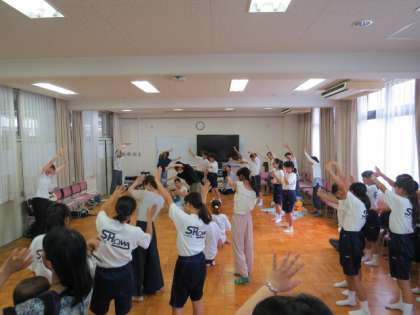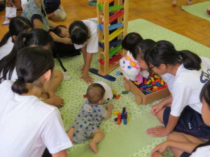 今年も阿倍野区保健福祉センターから保健師さんに来ていただき、「手足口病」と「熱中症」のお話をしていただきました。そして引き続き、リトミックで楽しく体を動かしました。その後は、いよいよ自由あそびの時間です。