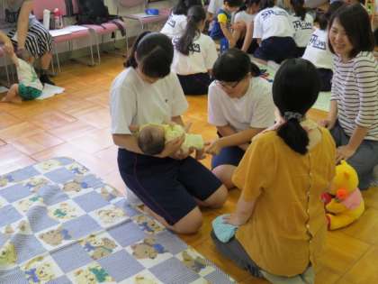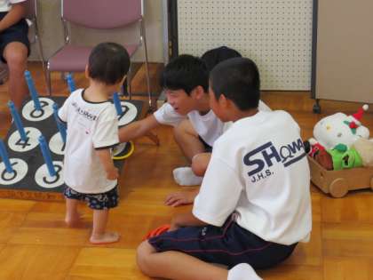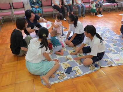 自由あそびの時間では、中学生と乳幼児のふれあいや、お母さんどうしのふれあいができました。事後のアンケートでも中学生たちは、日頃ふれあうことのない乳幼児たちとの時間を持てたことがとてもよかったと答えていました。