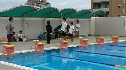 2年生が水泳大会を行いました。開会宣言、校長先生あいさつに続き、足立さん、西岡君の力強い選手宣誓が行われました。最初の種目、水中ランニングから競技が始まりました。