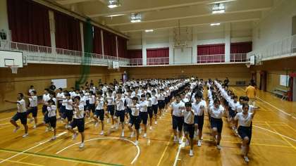 今日はあいにくの雨のため、体育館で全体練習を行いました。学年別に行進を行いましたが、どの学年・学級も素晴らしいできばえです。優勝めざして頑張ろう。