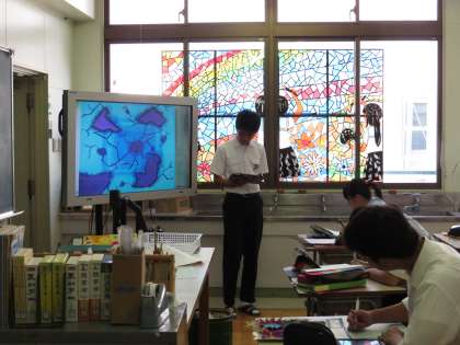 本日、3年の美術の授業でタブレット端末を使った作品発表を行いました。一人一人が制作した「抽象画」の作品を電子黒板に映し出すと同時に、「作品のテーマ」「工夫したところ」などを皆のタブレット端末に配付(配信)してプレゼンを行いました。そして、それぞれの発表が終わるたびに鑑賞プリントに発表の感想をまとめました。