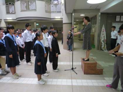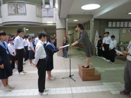 後期生徒会役員および後期学級委員の認証式を行いました。校長先生から5名の新生徒会役員一人一人に認証状が手渡され、引き続き学級委員を代表して、3年2組の学級代表2名に認証状が手渡されました。