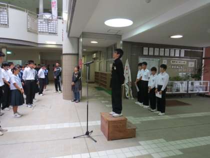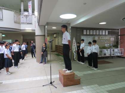 認証式後、本日で退任する3年生の前期生徒会役員一人一人があいさつをし、その後、後期生徒会役員を代表して新生徒会長が就任のあいさつを行いました。前期役員の皆さん本当にお疲れ様でした。新役員の皆さんは良き伝統を引き継ぎ、しっかりとがんばってください。