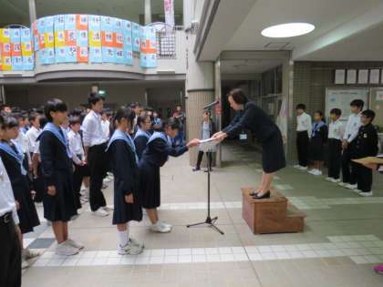 本日、朝の全校集会で先日行われた大阪市立中学校総合文化祭展示発表 美術の部において発表した32名の美術科の作品に対する表彰を行いました。集会では、校長先生から各学年の代表に表彰状が授与れました。