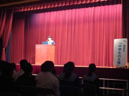 平成29年度「中学生の主張」大阪大会で審査員特別賞を受賞した3年生徒1名と努力賞を受賞した3年生と2名による発表が行われました。