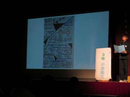 「卒業論文」は3年全生徒が原稿用紙20枚を書き上げたものです。今回はその中から12名の生徒がそれぞれ知り得た情報、導き出した結論を発表しました。