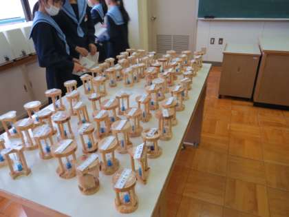 4F被服室では、技術科「砂時計」、「3Dプリンターを使用した人形制作」、家庭科「実習作品・レポート」の展示がありました。