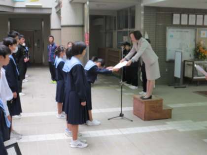 本日20日、朝の全校集会で表彰状の授与を行いました。最初は大阪市立中学校総合文化祭でポスター原画に応募した美術部員に対する表彰です。代表で、優秀作品に選ばれた3年生が授与しました。引き続き、昨日行われた「阿倍野区中学生親善駅伝大会」において陸上部が男女ともに3位となり、校長先生から表彰状が授与されました。