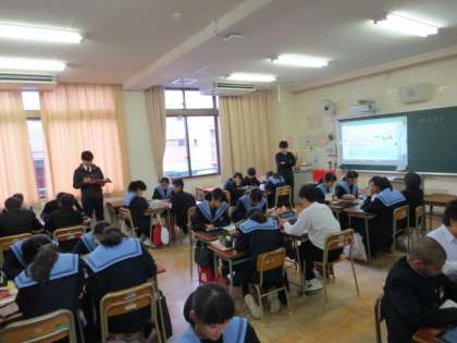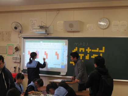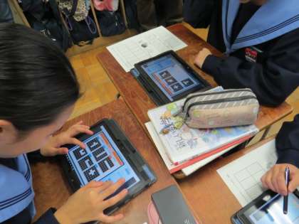 5つの正方形を使ってできる平面図形が何通りあるか考えたのち、パズルのしきつめを,平行移動,回転移動,対称移動という見方で観察し、図形どうしを重ね合わせるには,どのように移動させればよいかを考え、あてはめていきました。