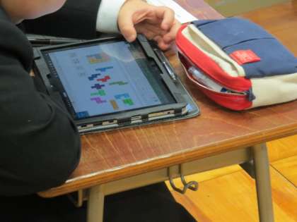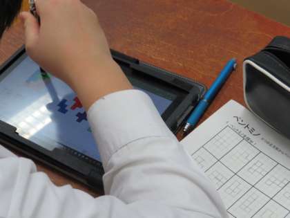 特別支援学級でも1年2組と同様にペントミノを行いました。ペントミノ12種類を見つけ、それらの図形を移動して、決められた形に敷き詰めていきました。
