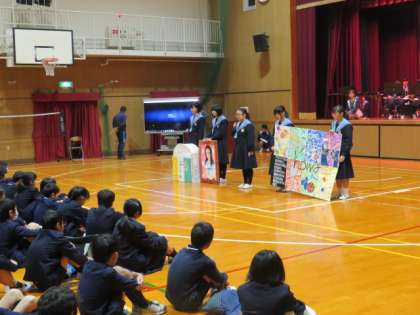 12月11日(月)午後より長池小学校の6年生を招いて、部活動体験を行いました。はじめに体育館で各部からの紹介や実演を見学してもらった後、あらかじめ希望をとっていた部に分かれて、活動体験をしました。