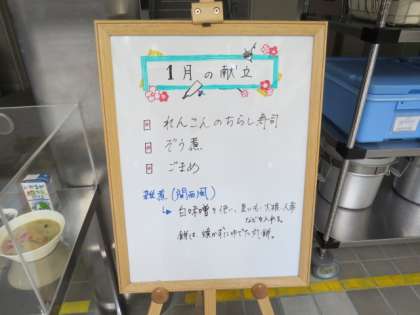 蓮根のちらし寿司、雑煮、ごまめ、牛乳 でした。
