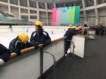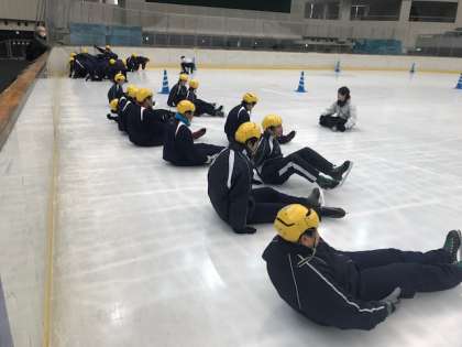 本日31日(水)、1年生は大阪プールアイススケートリンクに行きました。初めて氷上に立つ生徒も多く、思った以上にツルツルすべる足元に、手すりが離せません。まずは基本中の基本、座った状態から立つ練習です。