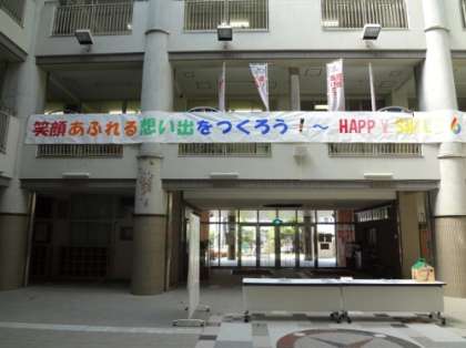 ピロティーに、3年生の修学旅行委員が作成した修学旅行のスローガンが掲げられています。明日は事前指導が4〜5限目に行なわれます。現金や食べ物以外の修学旅行の持ち物をカバンに詰めて持ってくることになっています。もちろん3限目までの授業の準備も必要です。くれぐれも忘れ物のないように!