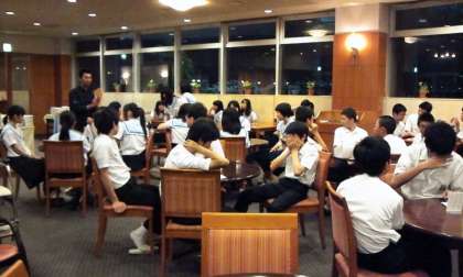 朝食なのでレストランに集まってきました。とても眠そうです。