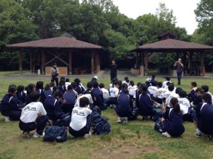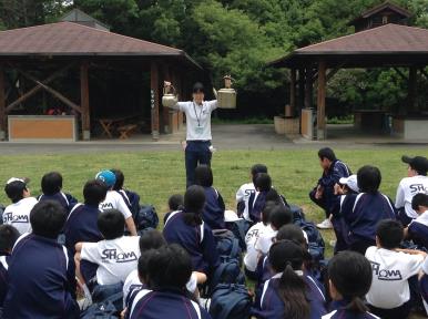 自炊を開始する前に、センターの方から注意事項を話していただいています。みんな、しっかり話を聞いて、おいしいご飯をつくりましょう。