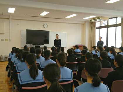 1年生が多目的室でオリエンテーションを行いました。中学校へ毎週火曜日に来ていただいているスクールカウンセラーの先生に説明をしていただきました。