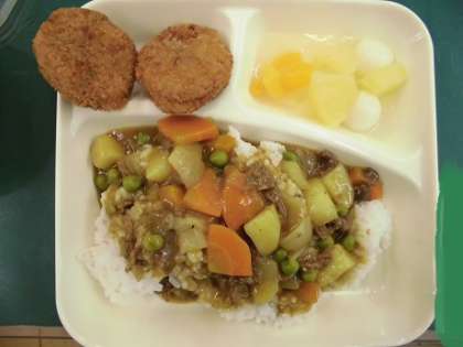 メニューは「かつカレーライス」と「フルーツ白玉」。