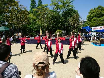 4月29日の「昭和の日」にちなんで、桃ヶ池公園を中心に、第13回「どっぷり昭和町」が開催されました。オープニングに続いて「夢舞ing」の発表がありました。夏を思わせる陽気の中、1年生も含めて熱気溢れる躍りを披露してくれました。
