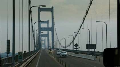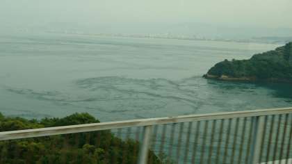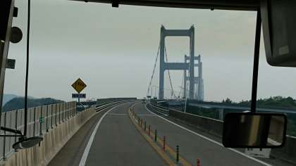 来島三連橋を通過しています。しまなみ海道で最も美しい橋だそうです。海には渦潮が見えています。