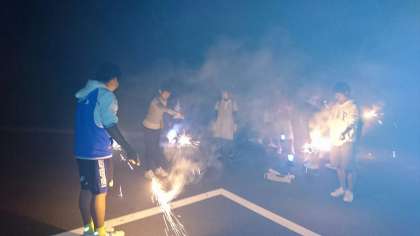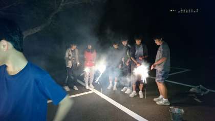 レクリエーション大会はホテルの下にあるキャンプ場で行いました。各クラスの班ごとに花火大会です。ろうそくの火が消えることもあり、少し時間がかかりましたが、無事終了しました。