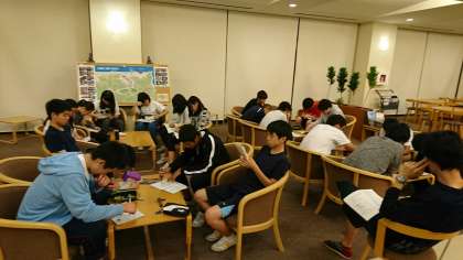今日の締めくくりの室長会議です。今日の行動を振り返り、明日の活動に活かすための反省をし、室長が部屋のメンバーに伝えます。並行して就寝準備をしています。気分は高揚していますが、身体は疲れています。しっかり睡眠をとりましょう。