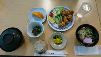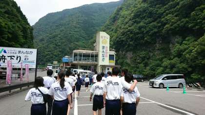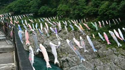 昼食は大歩危のレストランです。渓谷にたくさんの鯉のぼりがかぜをきって泳いでいます。