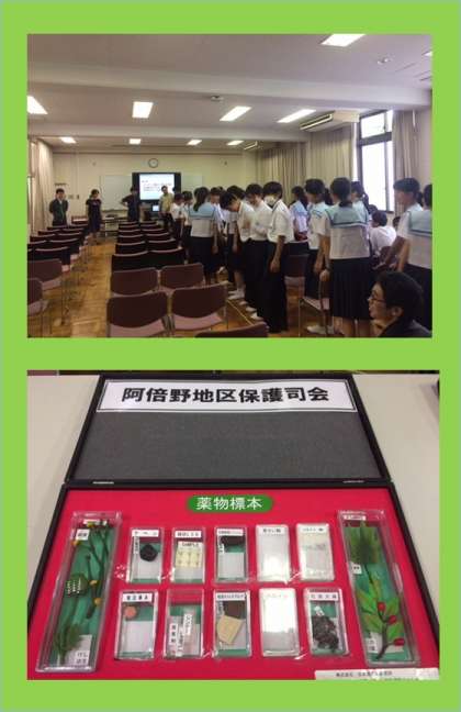 阿倍野区の保護司会の方6名と阿倍野警察署少年係の方が来校され、子どもたちの為に、お話を聞かせていただいたり、生徒とロールプレイングをしたり、また薬物標本を持って来てくださいました。
