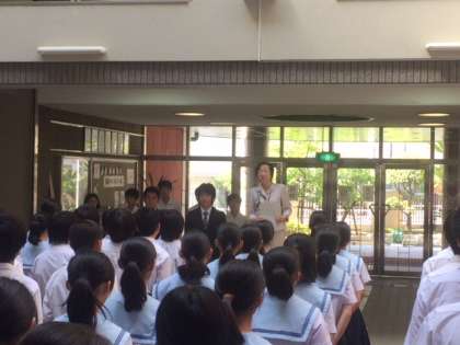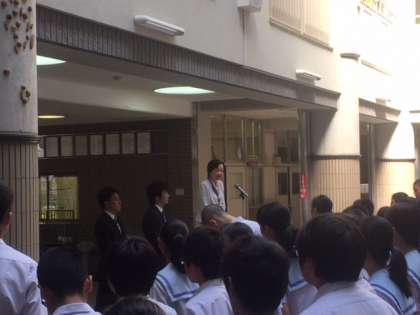 少し緊張気味でしたが、生徒の前で元気よく挨拶されました。