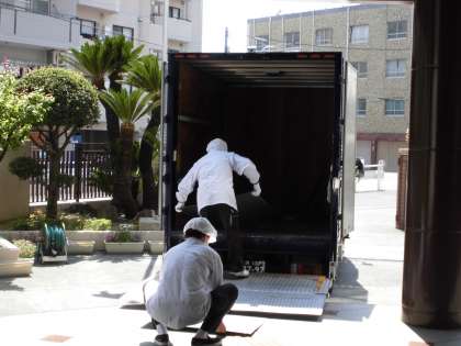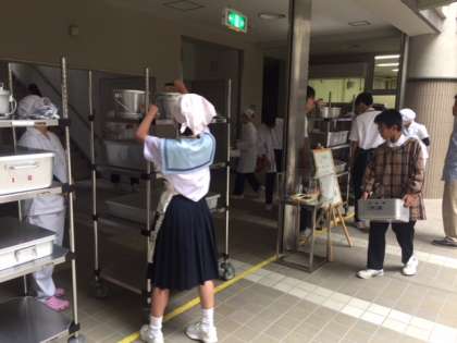 給食調理員さんが作ってくださった給食を配送員さんが運んできて、配膳員さんが各教室用に準備してくれています。