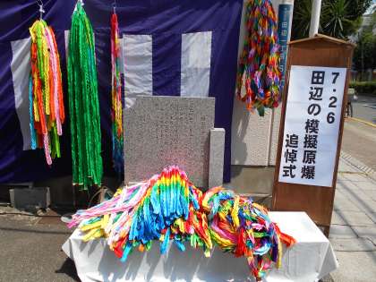 今から73年前の7月26日午前9時26分に、現在の田辺小学校の北側(本校から400m程東側)に「模擬原子爆弾」が落とされ、多数の方が犠牲になりました。