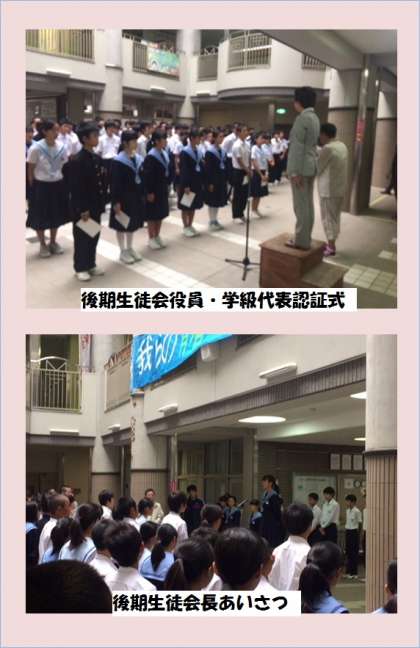 続いて、後期生徒会役員と学級代表の認証式を行いました。前期生徒会で活躍してくれた生徒会役員一人一人から最後の挨拶がありました。昭和中学校をより良くする為に本当にご苦労様でした。後期生徒会長の南さんからは決意と今後の抱負が語られました。みんなで昭和中学校をより素晴らしい学校にしていきましょう!