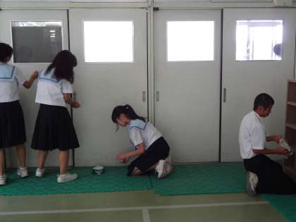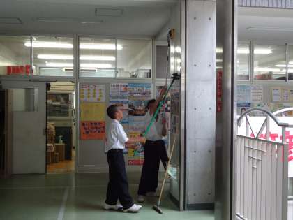 大清掃を行い、1学期の汚れをきれいに落としました。教室や廊下以外の特別教室や高い壁の汚れも一生懸命に掃除しました。