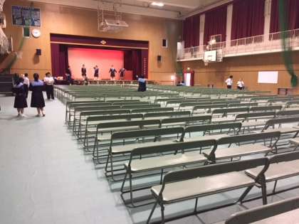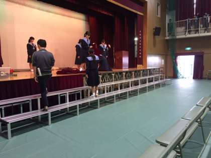 待ちに待った文化発表会〔舞台の部〕も明日になりました。体育館の会場設営は、1年生がシートを敷いてレイアウト通りに等間隔に椅子を並べてくれました。