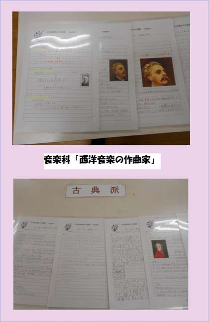 第1理科室では音楽科の夏休みにおこなった調べ学習の作品が展示されていました。工夫を凝らしてレポートにまとめられていました。