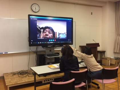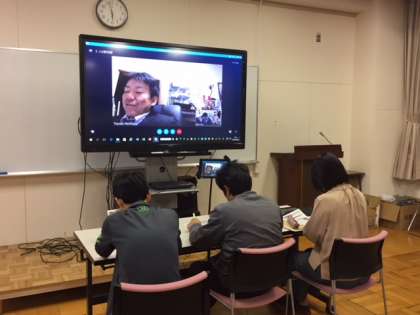 今回はSkype(スカイプ)を活用して、和歌山大学の豊田先生とネットでつなぎ、4つの教科の先生が順番にテレビ画面の前に座って指導案の検討を行いました。