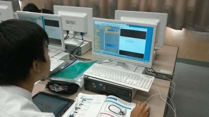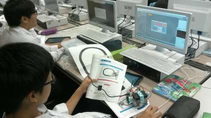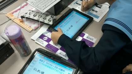 プログラミングについて学習しました。ビジュアルプログラミング言語を使用したArtecRoboの計測と制御実習を行い、調べたことをデジタルノートに書かせて情報の整理と収集を行いました。