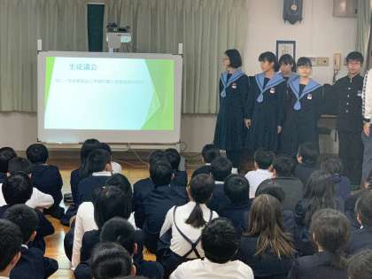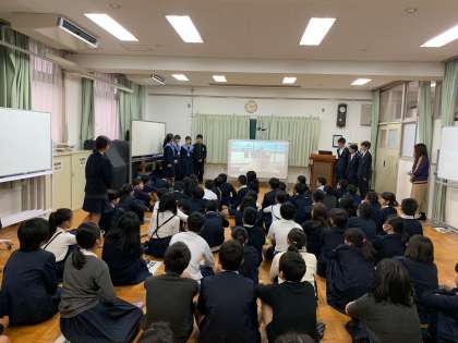 本校は、保健委員会が制作した「給食のようす」の動画と3年生の制作した「修学旅行のスライドショー」を発表しました。その後、6年生から中学校生活についての質問がたくさん寄せられました。