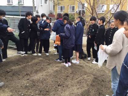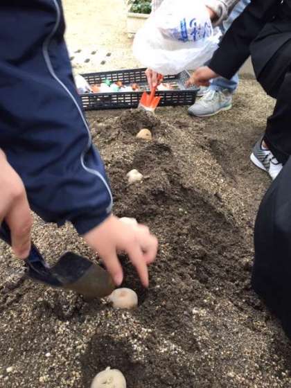 学校元気アップコーディネーターさんのご指導のもと、1.2年生のふれあい委員でジャガイモの種芋を植えました。