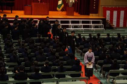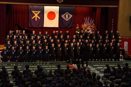 曲目は「卒業の唄〜アリガトウは何度も言わせて〜」「大切なもの」の2曲。3年生は最後の力を振り絞り、式場いっぱいに歌声を響き渡らせました。指揮もピアノ伴奏も素晴らしいものでした。