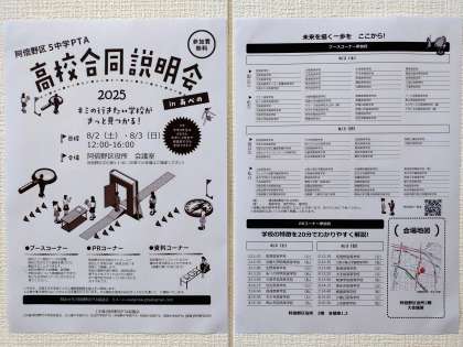 『阿倍野区5中学校 高校合同説明会2025』が、明日の8月2日(土)と3日(日)の12時00分〜16時00分(両日とも)に阿倍野区役所で開催されます。