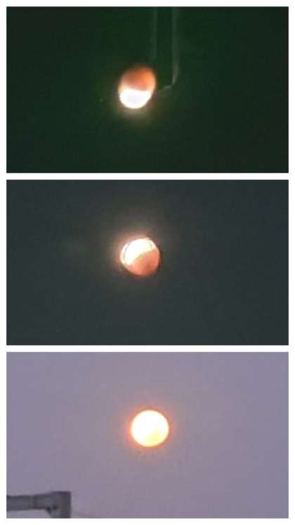 「生徒の皆さん、『皆既月食』観ましたか?」写真は、上から2時30分、4時00分、一番下は5時です。「眠っ!」