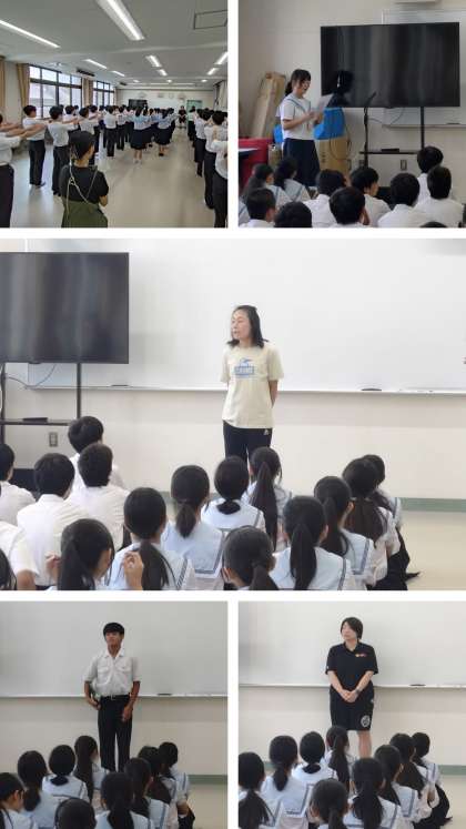 今朝の2年生の学年集会の様子です。はじめに、学年代表の生徒から「1日1回、ポジティブな声かけをしましょう!」という今週の目標が伝えられました。