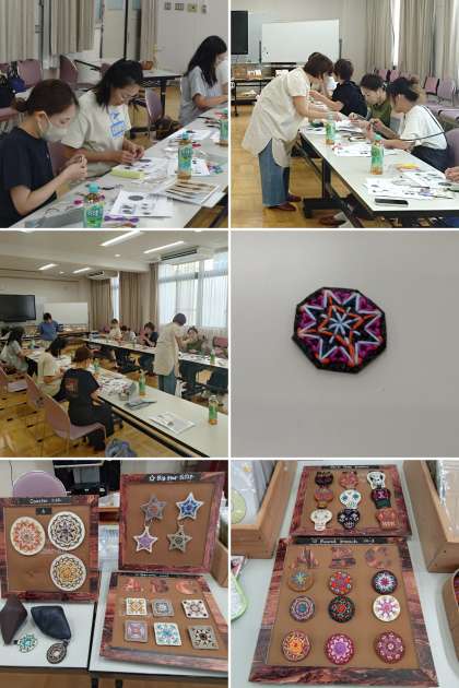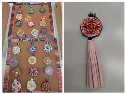 八角形のタッセルキーホルダーと円形コースターに挑戦しました。作業が始まると、まるでカニを食べているように誰もしゃべらず作業に夢中!