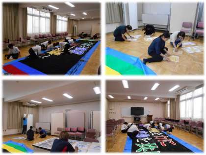 今年の文化発表会と体育大会のスローガン(「個性を力に 感動を共に」)の旗づくりの総仕上げをしているところを取材しました。これまで生徒会執行部や有志、そして生徒会の先生方にも手伝ってもらいながらようやくここまできました。いっぽう、部屋の奥では1年生の先生方が何やら作業をしています。1年生のみんなが頑張って塗ったものをつなぎわせて1つの大きな作品にしているところのようです。いったいどのような仕上がりになるのでしょうか?楽しみですね!