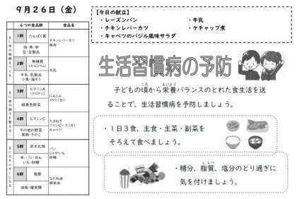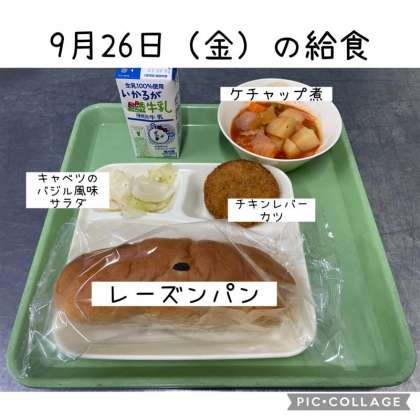 遅くなりましたが先週金曜日(9/26)の給食です。文化発表会のため少しバタバタした昼食時間だったかもしれませんが、美味しくいただけたでしょうか。チキンレバーとレーズンに共通する栄養は鉄分で貧血予防に効果があるとされているので、好き嫌いせずしっかり食べてほしいです。