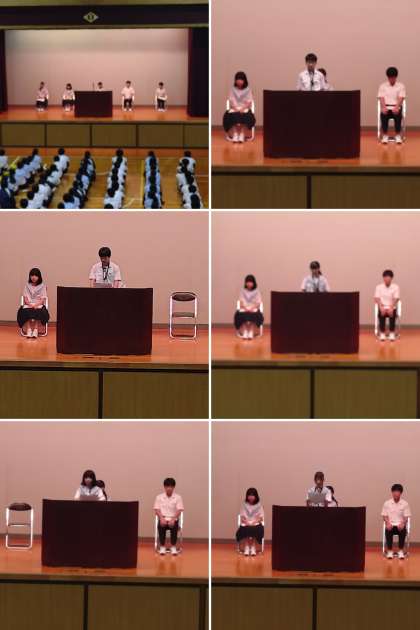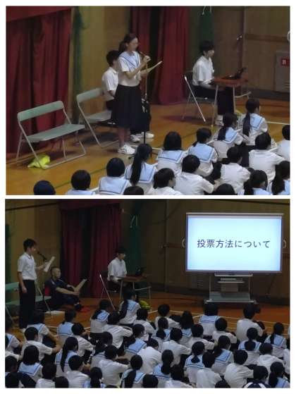 「1分前活動をさらに充実させたい」「意見の言える不満のない学校」「さらに良い雰囲気の学校にしたい」「生徒会活動の見える化」「あいさついっぱい・笑顔いっぱいの学校」など、生徒会役員としてのやる気が十分に感じられた演説でありました。