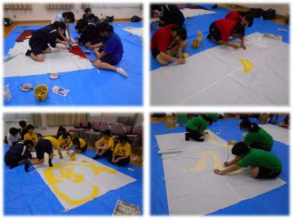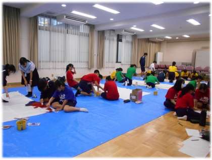 体育大会に向けて、今日から団旗の制作が始まりました。それぞれの団で選ばれたデザインを大きな布に描き、色を塗っていきます。今年はどんな団旗が出来上がるのか、楽しみですね!